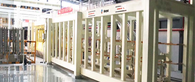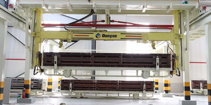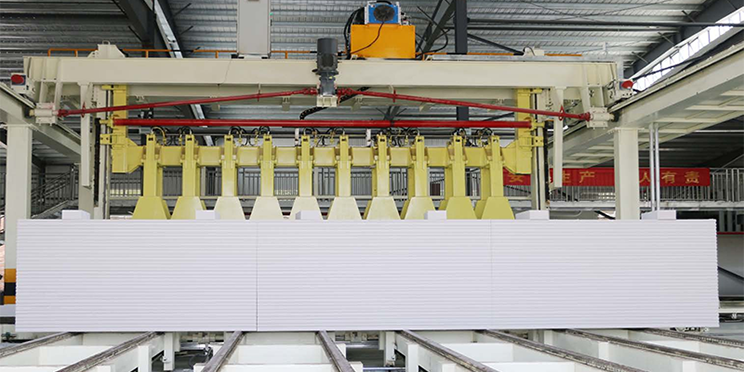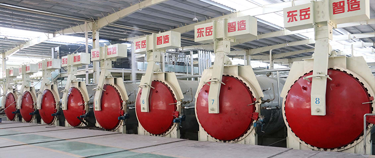 加氣板材經(jīng)過蒸壓釜,坯體獲得最終的強(qiáng)度和性能。出釜后的產(chǎn)品,通過東岳最新研發(fā)的掰板打包系統(tǒng),不但提高產(chǎn)品合格率同時解決了砌塊、板材同時分離的難題。