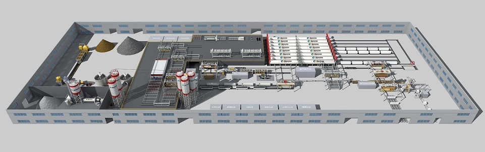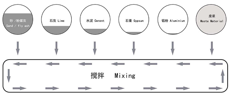 料漿、膠結(jié)料、石膏和鋁粉都分別通過相應(yīng)自動計量稱計量,后在攪拌機(jī)內(nèi)高速攪拌,澆注到模箱后進(jìn)行氣泡梳理。整個體系由 PLC 系統(tǒng)進(jìn)行自動控制,保證工序的精確和高效。